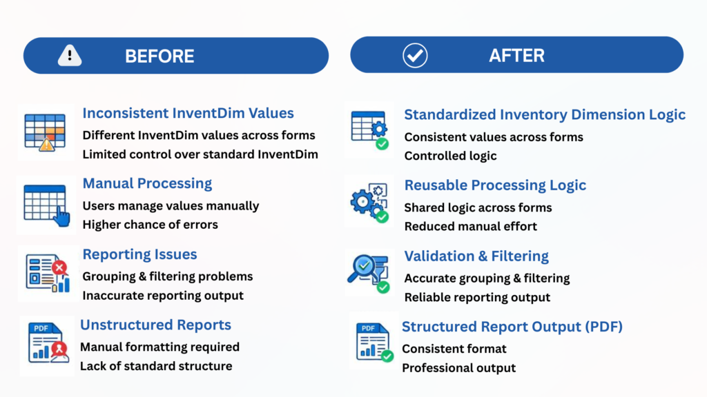 To address these challenges, standardized InventDim logic and reusable processing methods were implemented across forms and reports. This approach improved reporting accuracy, ensured consistent InventDim handling across the system, and enabled structured PDF report outputs.