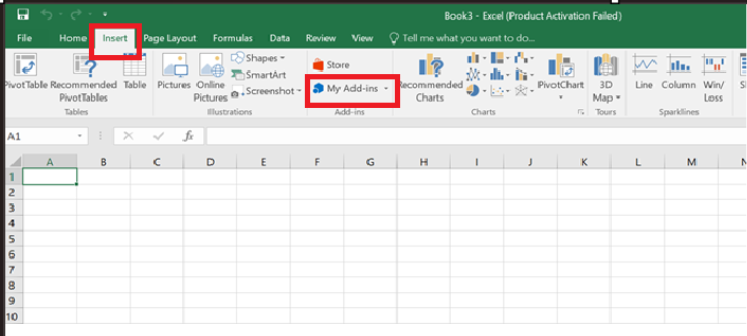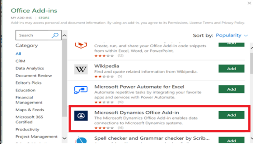 Step 2: Next, go to the Insert tab in Excel and click on Get Add-ins. In the Office Add-ins store, search for Microsoft Dynamics Office Add-in and add it to Excel