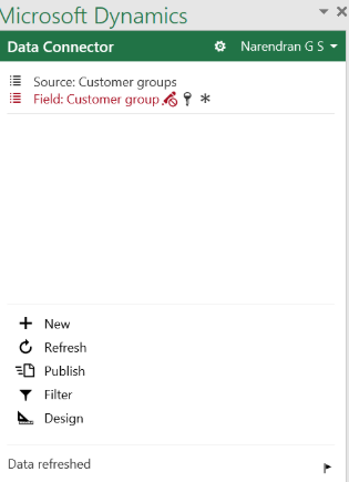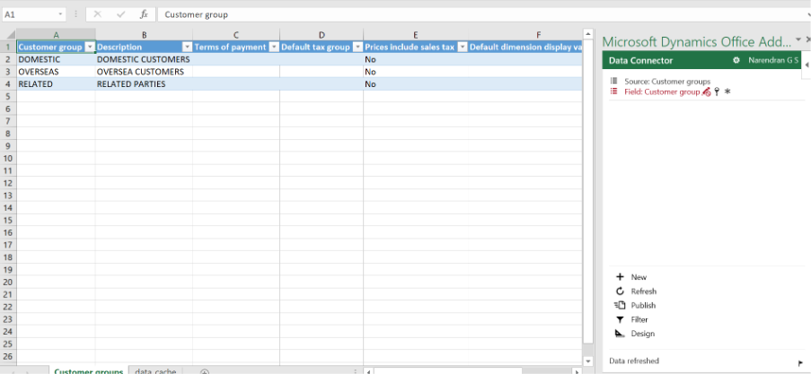 Step 5: When the Excel file is opened, the Microsoft Dynamics Office Add-in loads on the right side of Excel. The user can click Refresh to load the latest data from the form and Publish to push any changes back to Dynamics 365