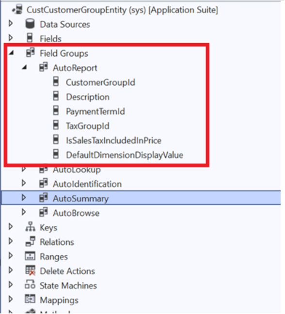 Step 2: Add only the required fields to the data entity and include those fields in the Auto Report field group. This ensures that the fields are visible when the data is opened in Excel.