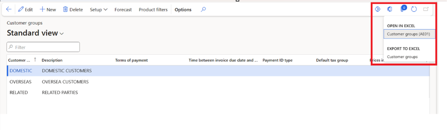 Step4: Now, open the target form in Dynamics 365 Finance & Operations. On the form toolbar, click the Office (Excel) icon. The system automatically detects the related data entity and generates an Excel template based on it. This template is downloaded to the user’s machine.